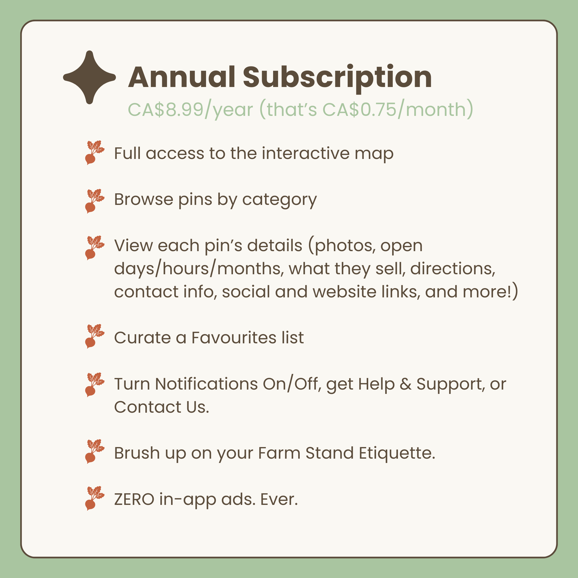 The annual subscription gives you FULL ACCESS to every feature on the app, helps keep the platform ad-free, and costs about the same as a loaf of local sourdough. Learn more on our Support page.